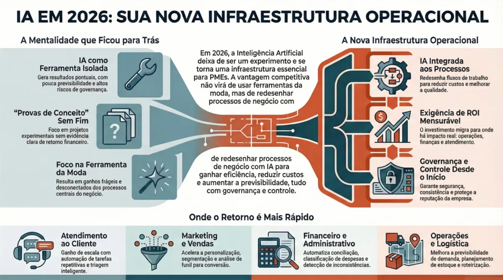 Relatórios recentes mostram que a adoção de IA já está alta no mercado como um todo, mas a maturidade ainda é baixa: muita experimentação e pouca padronização. Entre PMEs, o avanço é real, porém desigual. O cenário para 2026 aponta uma transição clara: sai a fase “testei um chatbot” e entra a fase “eu opero processos com IA”. Para o executivo, a pergunta certa não é “qual ferramenta está na moda?”, e sim: quais processos do meu negócio podem ser redesenhados para reduzir custo, melhorar qualidade e aumentar resposta ao cliente, sem criar uma bomba de risco reputacional ou de dados.